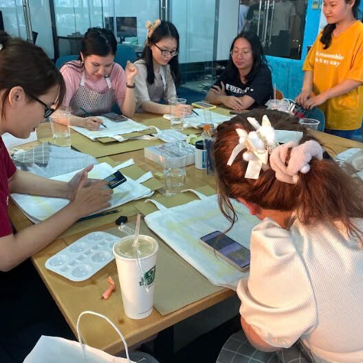 Những nét cọ nhẹ nhàng lướt trên vải, tạo nên một dải màu rực rỡ như kính vạn hoa. Mỗi đường nét là minh chứng cho sự sáng tạo và cá tính riêng biệt của từng người tham gia. Căn phòng như được thắp sáng bởi tinh thần cộng đồng, tiếng cười và những chia sẻ giữa các “nghệ sĩ” – từ những bạn trẻ đam mê nghệ thuật đến các tín đồ thủ công kỳ cựu. Workshop do các giảng viên dày dạn kinh nghiệm từ QUYNHWORKSHOP dẫn dắt, tạo ra một không gian đầy nuôi dưỡng, nơi mọi người được tự do thể hiện bản thân.