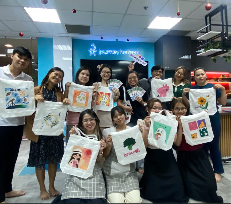 Workshop Vẽ Túi Vải gần đây của Journey Horizon là một “tấm toan” sống động kết hợp giữa sáng tạo và lối sống bền vững. Với sự tham gia của 25 người, không khí tràn ngập cảm hứng khi mỗi người mang đến một ý tưởng riêng, thổi hồn vào chất liệu vải thân thiện của những chiếc túi tote. Đây không chỉ là một hoạt động nghệ thuật, mà còn là bước tiến nhỏ nhưng ý nghĩa hướng đến lối sống xanh – khi mỗi chiếc túi vải được vẽ tay chính là cam kết cá nhân trong việc giảm thiểu sử dụng túi nhựa.
