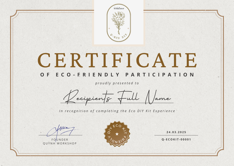 Tại Quỳnh Workshop, chúng mình tin rằng mỗi sản phẩm bạn tự tay hoàn thành là một thành tựu xứng đáng được công nhận. Vì vậy, khi bạn làm xong sản phẩm từ bộ Q-EcoKIT, bạn sẽ được cấp một Chứng nhận Hoàn thành DIY – DIY Certificate mang dấu ấn cá nhân và đầy tự hào.