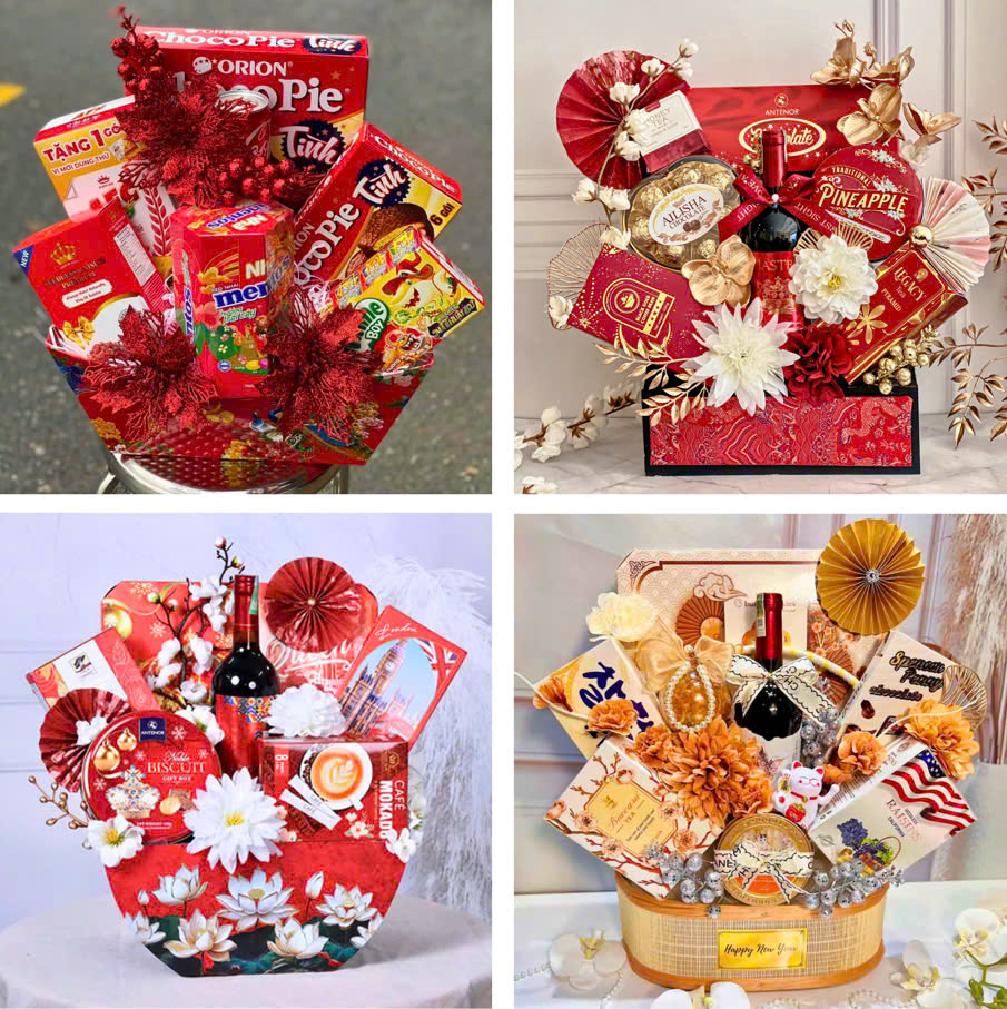 Bầu không khí tràn ngập sự hợp tác và cảm hứng khi những người tham gia cùng nhau thiết kế các bộ quà tặng độc đáo. Một số người chọn những kiểu trang trí cầu kỳ, nhiều lớp, trong khi những người khác lại hướng đến sự tinh tế tối giản, đảm bảo mỗi bộ quà đều là một tác phẩm nghệ thuật. Việc thêm những tấm thiệp Tết mang lại nét cá nhân, khiến mỗi món quà trở nên ý nghĩa hơn.