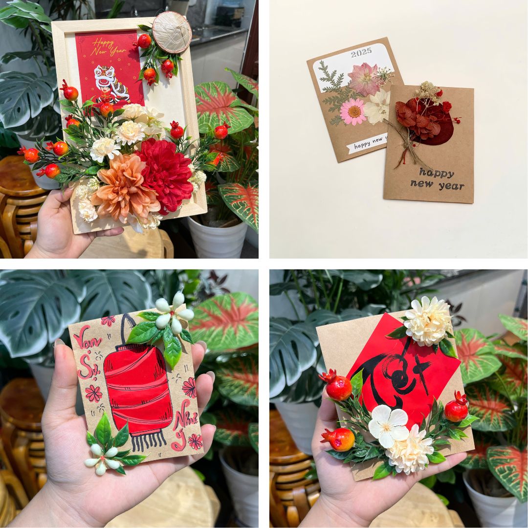 Workshop bắt đầu với phần hướng dẫn trực quan từ đội ngũ Quỳnh Workshop, chia sẻ cách phối màu, bố trí phụ kiện và trang trí thiệp để tạo nên tổng thể hài hòa, chỉn chu. Người tham gia được khuyến khích sáng tạo theo phong cách riêng, kết hợp yếu tố truyền thống cùng nét cá tính hiện đại.