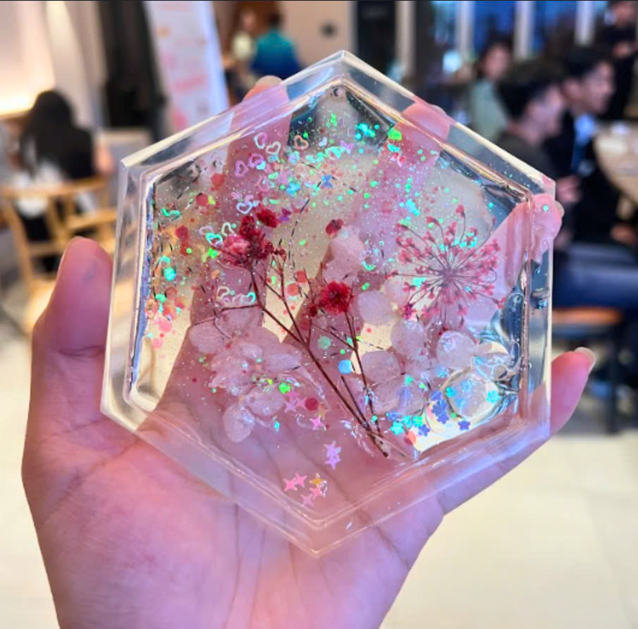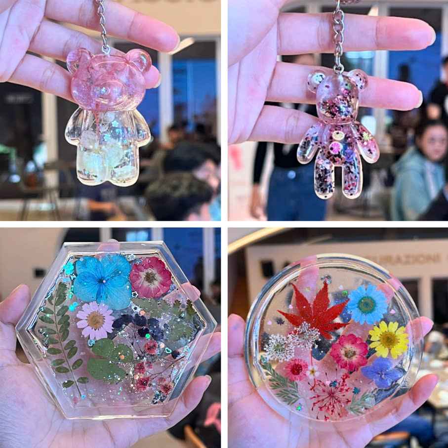 Workshop khởi đầu bằng phần hướng dẫn chi tiết về kỹ thuật resin, từ cách pha trộn nhựa resin, chọn màu sắc, đến cách sắp xếp hoa khô và các chất liệu trang trí. Với móc khóa và lót ly làm nền, mỗi người như trở thành một “nghệ nhân”, tự do lựa chọn gam màu, chất liệu và bố cục để tạo nên tác phẩm cho riêng mình.