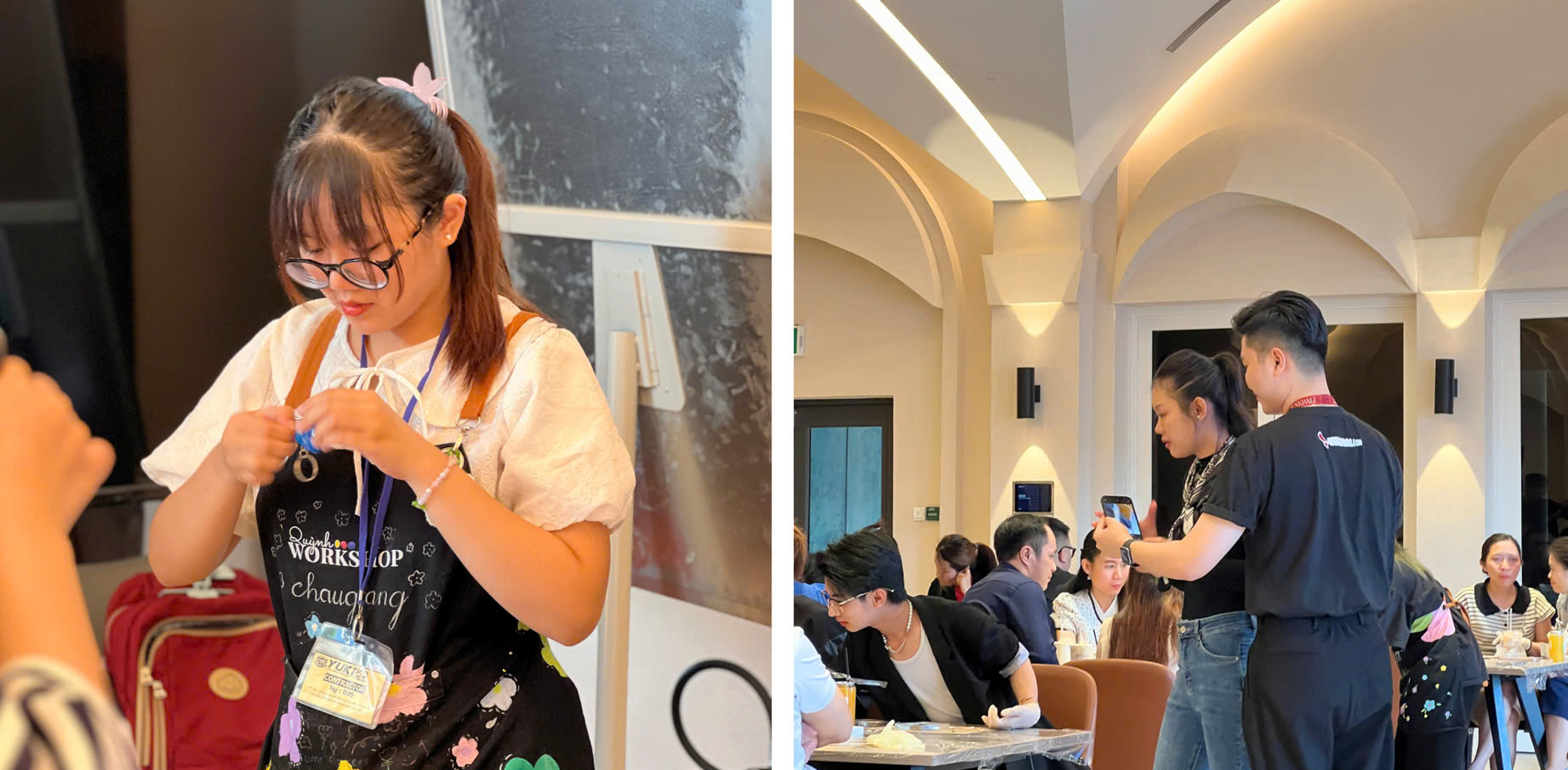 Không khí tại sự kiện rộn ràng và đầy cảm hứng. Có người chọn thiết kế lót ly tinh tế với hoa khô và lá, tạo cảm giác nhẹ nhàng, sang trọng; người khác lại yêu thích những chiếc móc khóa vui nhộn với màu sắc tươi sáng – lý tưởng để sử dụng hằng ngày. Tính thực hành cao giúp mọi người vừa thư giãn vừa gắn kết với đồng nghiệp và bạn bè trong không gian thân thiện, ấm áp.